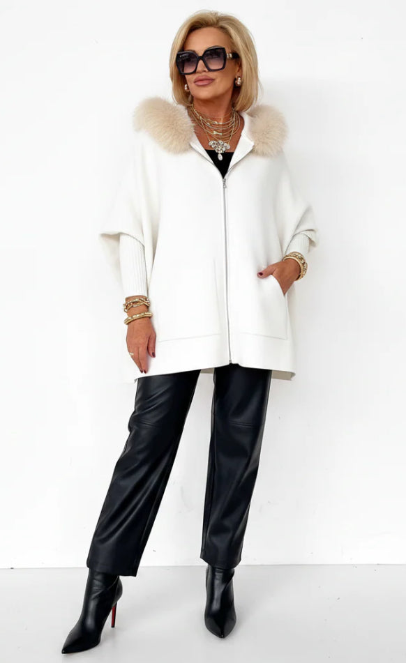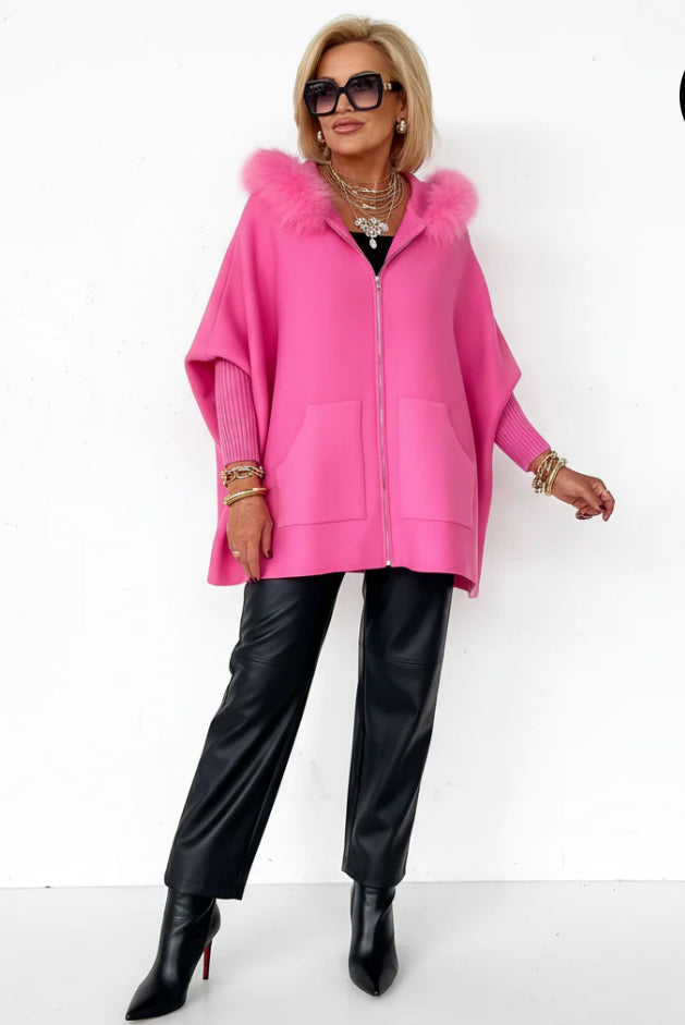Sofia-Mantella in lana con cappuccio in eco pelliccia