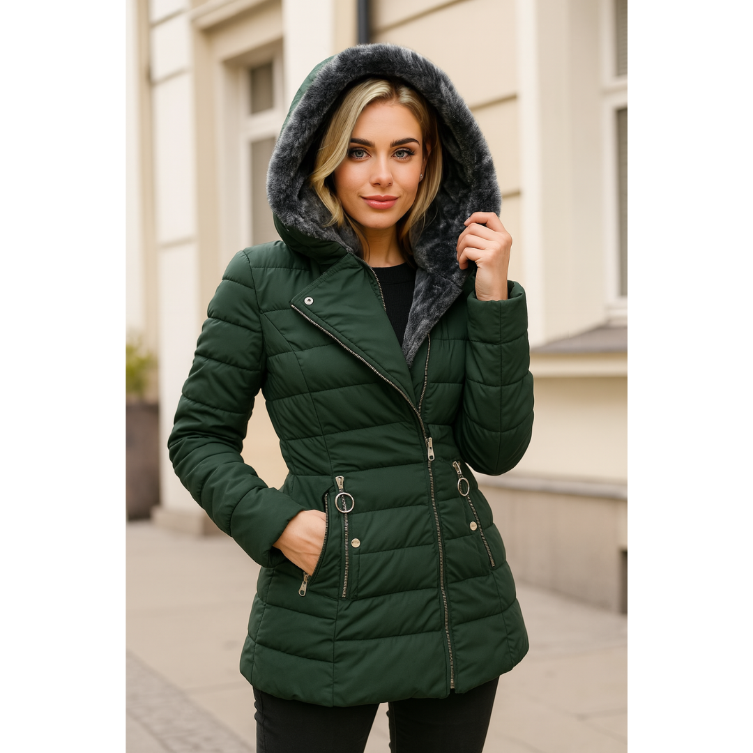 Il design trapuntato dona un tocco moderno e slanciato alla silhouette, mentre la fodera interna in morbida pelliccia sintetica garantisce un comfort eccezionale anche nelle giornate più fredde.